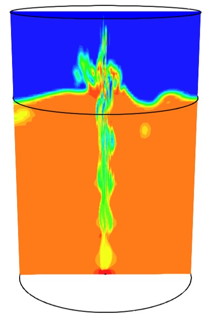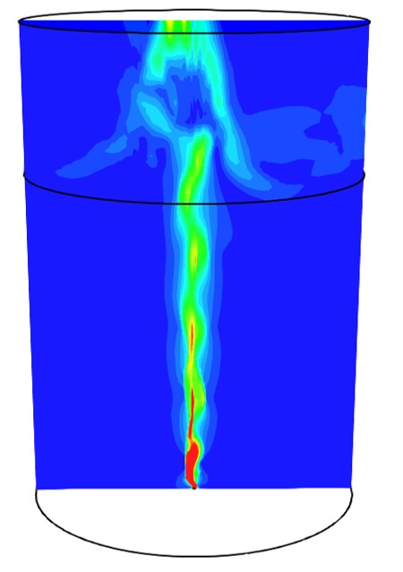 An industrial example of gas injection into a dense liquid metal melt is the ladle treatment of liquid metals in steelmaking. The animation is representing a simplified setup to illustrate the phenomenon. Argon gas is injected into molten steel to refine it, remove impurities, and improve inclusion cleanliness. This process is essential for producing high-quality steel.